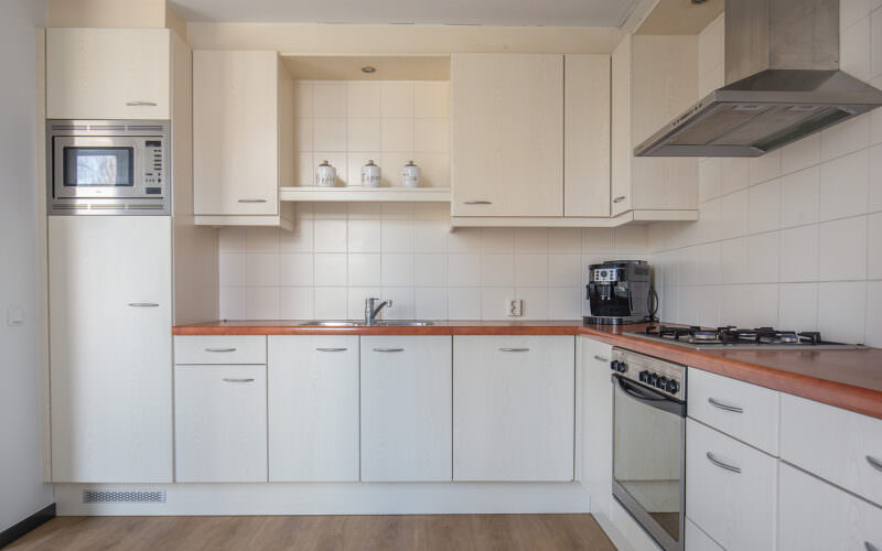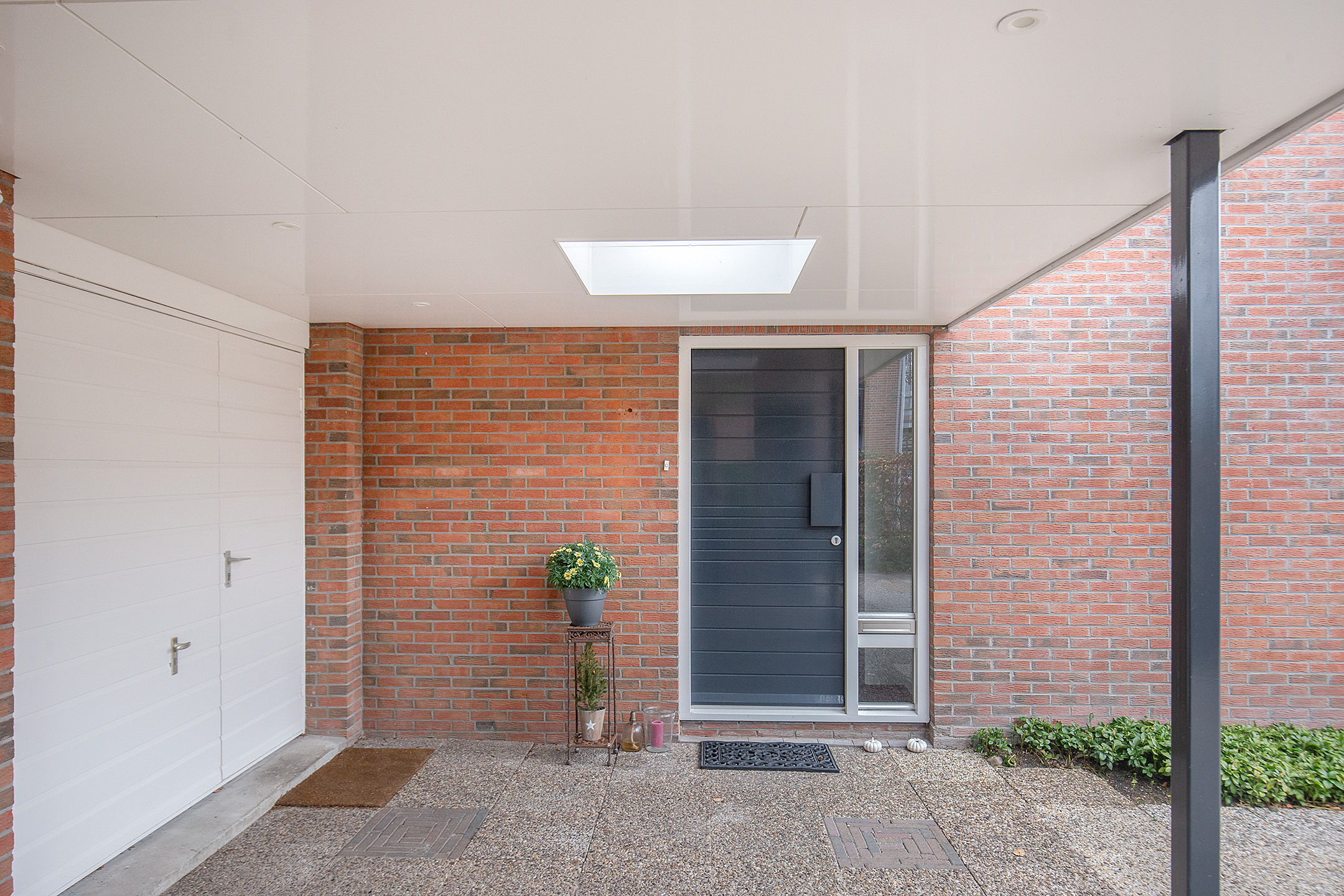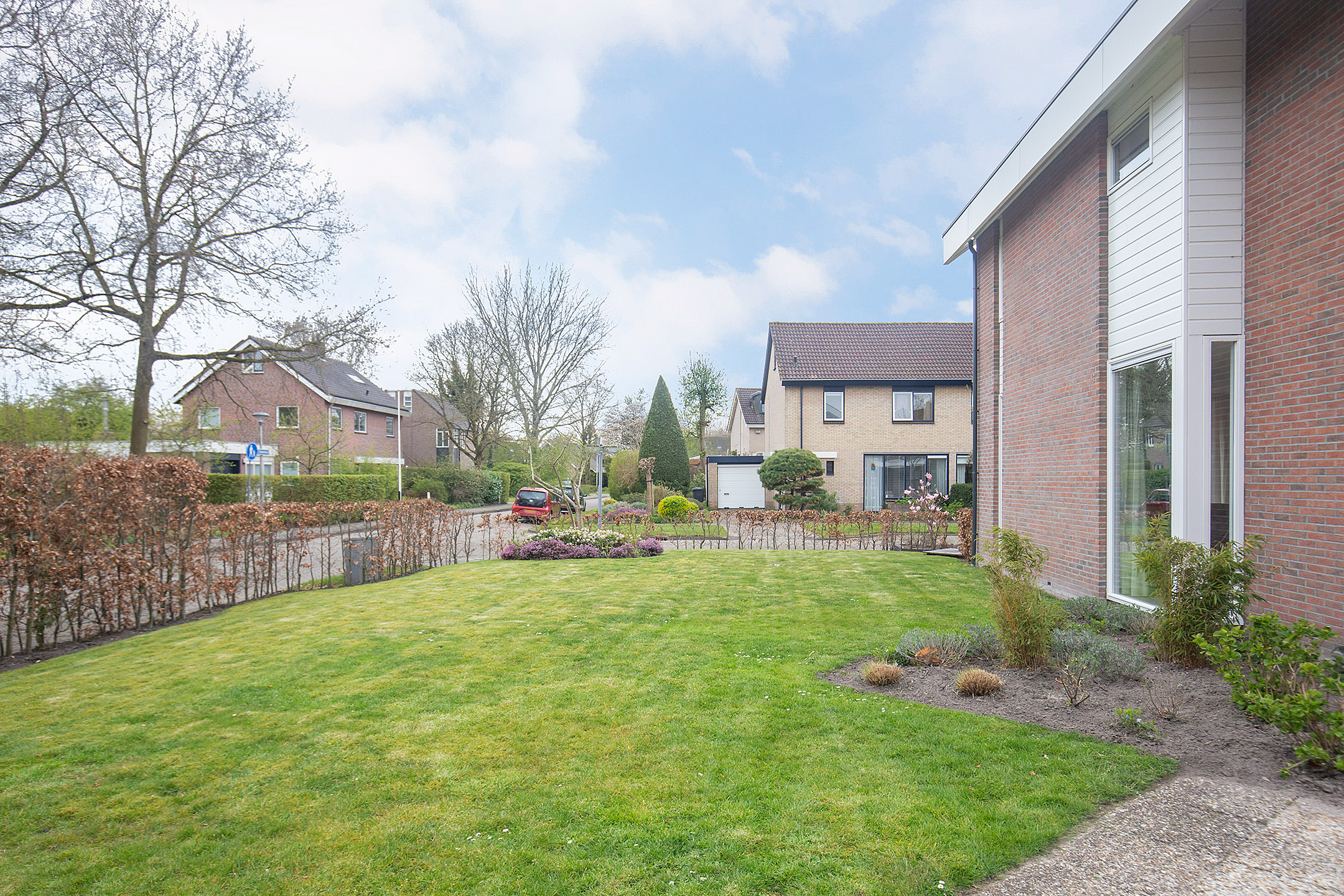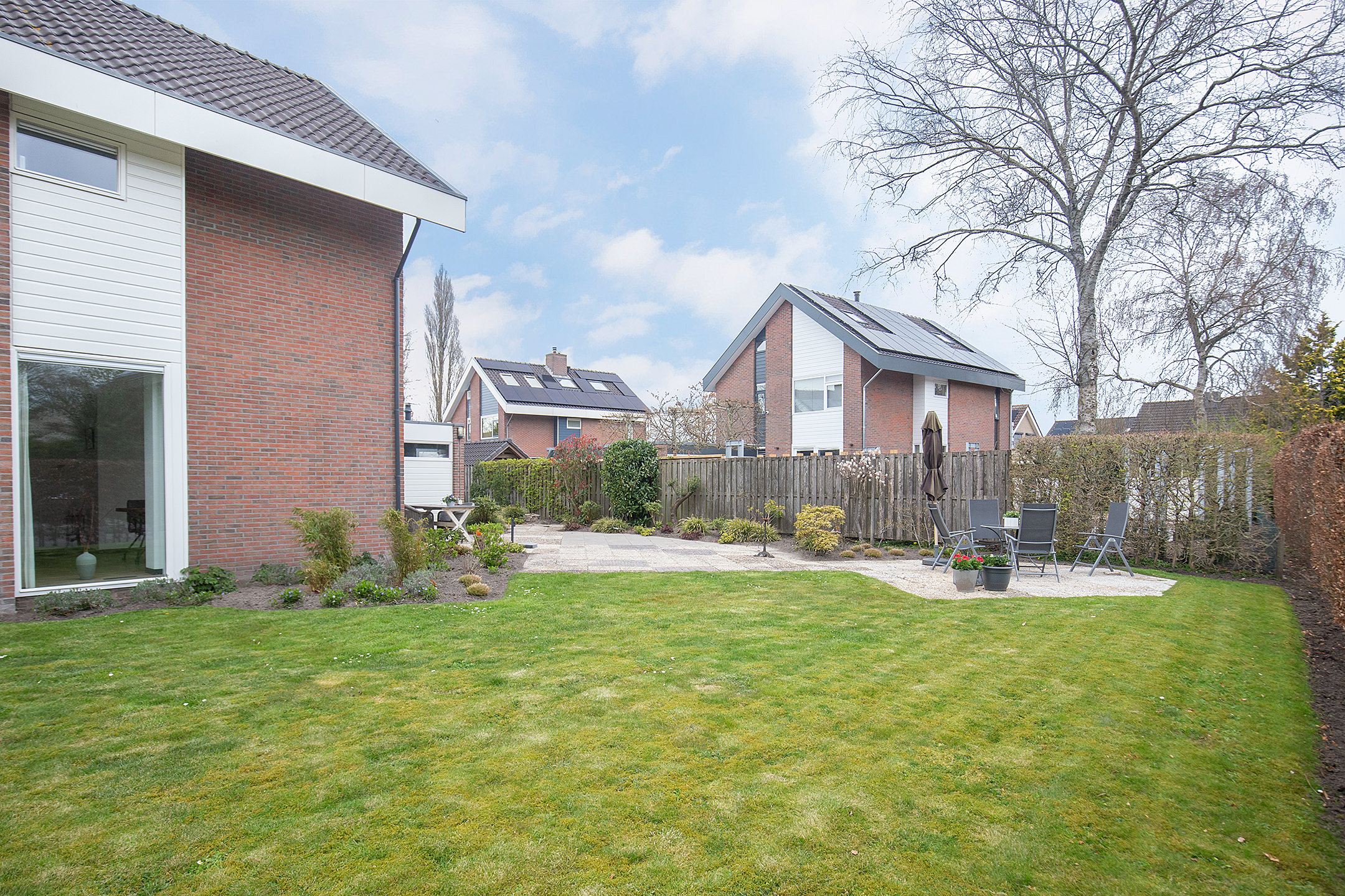 De entree is overdekt en geeft toegang tot de ruime hal met garderobe, trapopgang en moderne toiletinrichting, doorloop naar geriefelijke L-vormige woonkamer – 50 m2 – met prachtige lichtbeleving, inbouwhaard, schuifpui en fijn gestucte wanden. De keukenruimte is deels open en ingericht met een ruim opgestelde – neutrale – keukeninrichting voorzien van diverse inbouwapparatuur. De aangrenzende bijkeuken met c.v.-ruimte heeft aansluitingen ten behoeve van witgoed, een deur naar de tuin en geeft toegang tot de dubbele garage welke is afgewerkt met een betonnen vloer en uitgevoerd met een dubbele inrijdeur en deur naar de tuin.