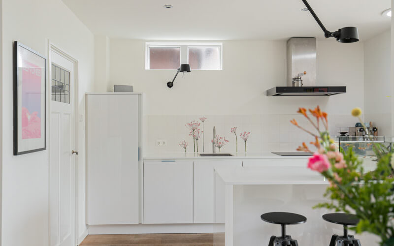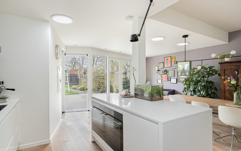 De Centrale entree van de woning is chique door de rijk versierde dubbele deur en geeft toegang tot de centrale hal welke net als alle vertrekken op de begane grond zijn belegd met een stoere-tijdloze plankenvloer. De hal heeft o.a.een uitgebreide elektrakast (12 groepen), een keldertje, vaste kast en een moderne toiletinrichting (wandcloset + fonteintje). De woonkamer heeft hoge ramen, binnenblinden, kamer-en-suite deuren met glas-in-lood, geornamenteerde schouw, vaste kasten en prachtige hoge ramen welke voor een mooie lichtinval zorgen. De woonkamer is aan de achterzijde op een stijlvolle wijze uitgebreid onder architectuur en heeft nu de functie van de tweede woonkamer/eetkeuken en heeft door toepassing van de open gevel (veel glas/tuindeuren) mooi uitzicht over het terras, tuin en gastenverblijf. De keukenruimte is deels open en geruisloos opgebouwd met een keukeninrichting (Siematic) welke is voorzien van diverse hoogwaardige inbouwapparatuur. De keuken is aanwezig maar ook weer niet, zeg maar….de aangrenzende bijkeuken is slim getekend met een schuifdeur gescheiden van het geheel en heeft naast de witgoed aansluiting een deur naar het terras.