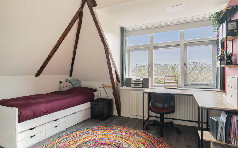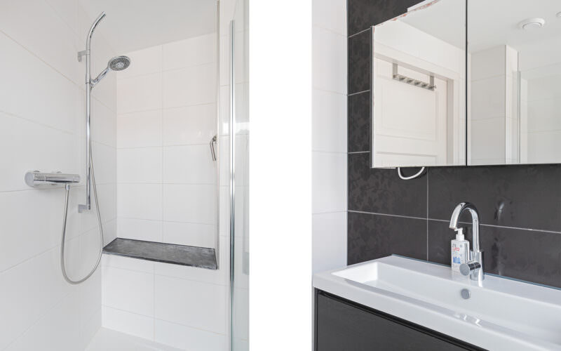De eerste verdieping is helemaal opnieuw ingedeeld en heeft op dit ogenblik een drietal slaapkamers welke veelal zijn uitgevoerd met een dakkapel en/vaste kasten. De badkamer is net als het overige sanitair, stijlvol en kwalitatief hoogwaardig en tijdloos uitgevoerd en is ingedeeld met een ligbad, badkamermeubel, handdoekenradiator, wandcloset, inloopdouche en inbouwverlichting.