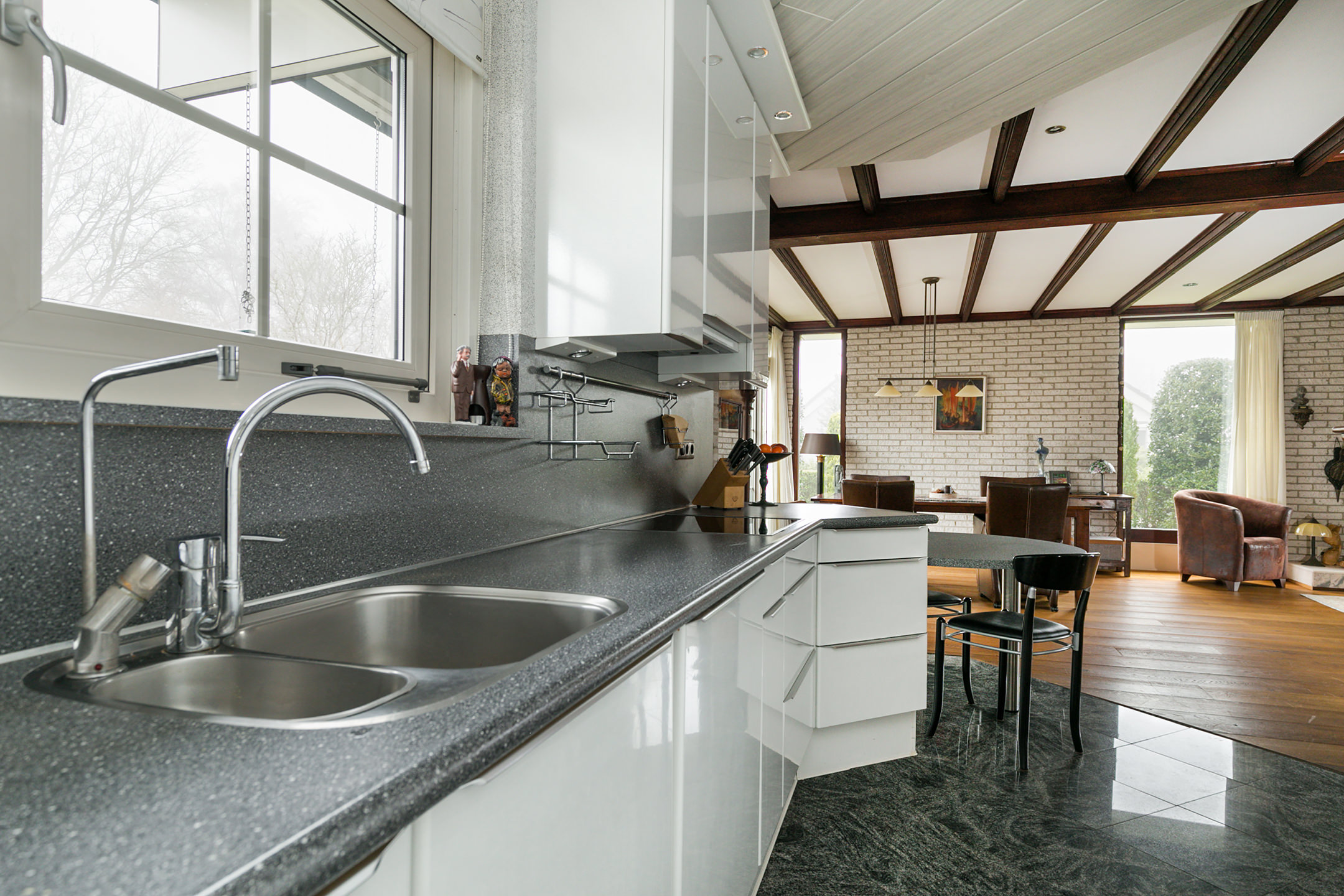 terras en tuin. Een deels open keukenruimte met uitgebreide keukeninrichting