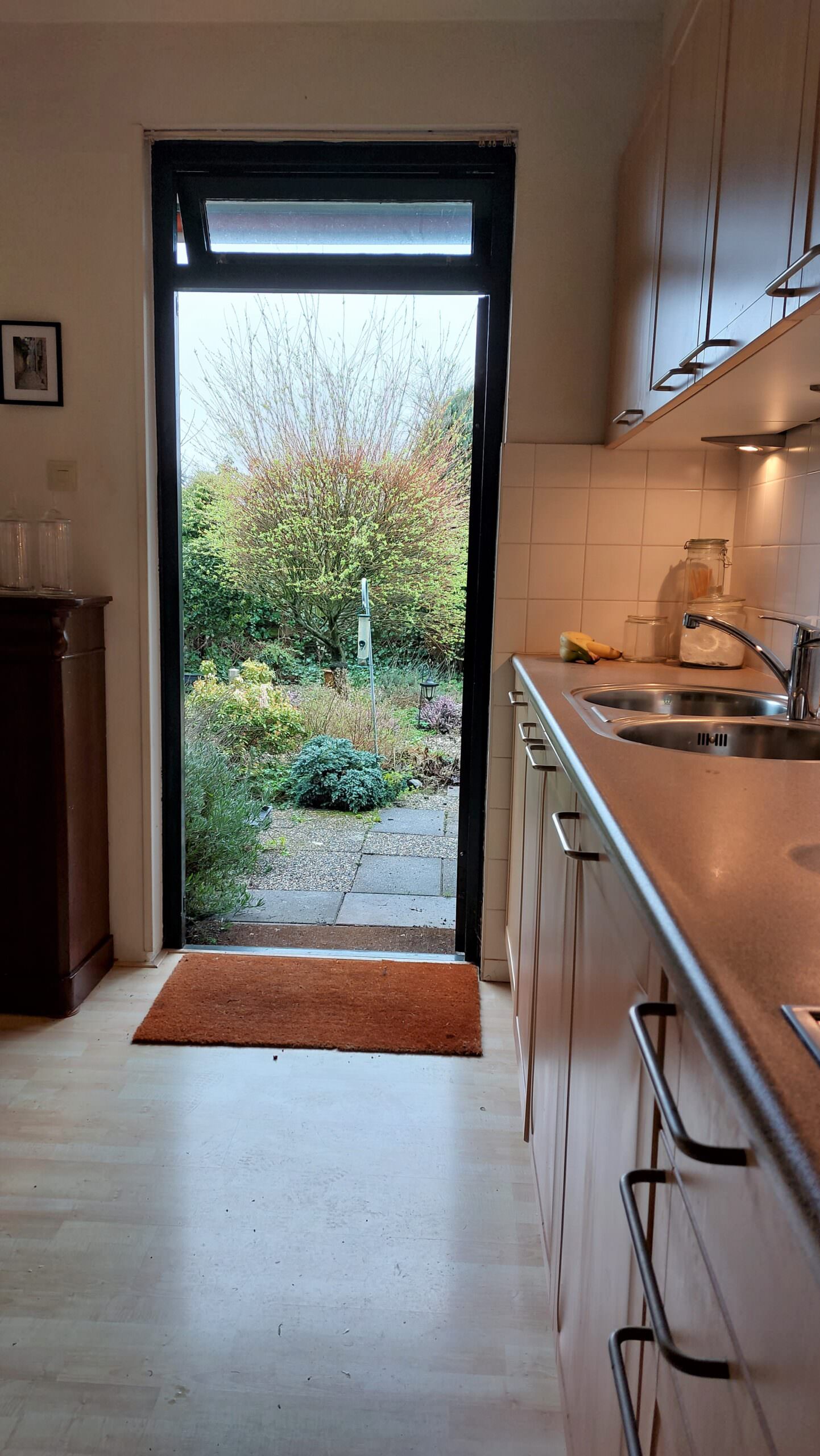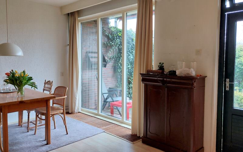 Overdekte entree, hal met garderobe en toilet, gezellige-lichte-woonkamer met originele, strak vormgegeven haard, trapopgang en grote panoramaramen met zicht op de achtertuin, deels open keukeninrichting met inbouwapparatuur (gedateerd), grote aangebouwde stenen garage welke is voorzien van een tegelvloer en verwarming.