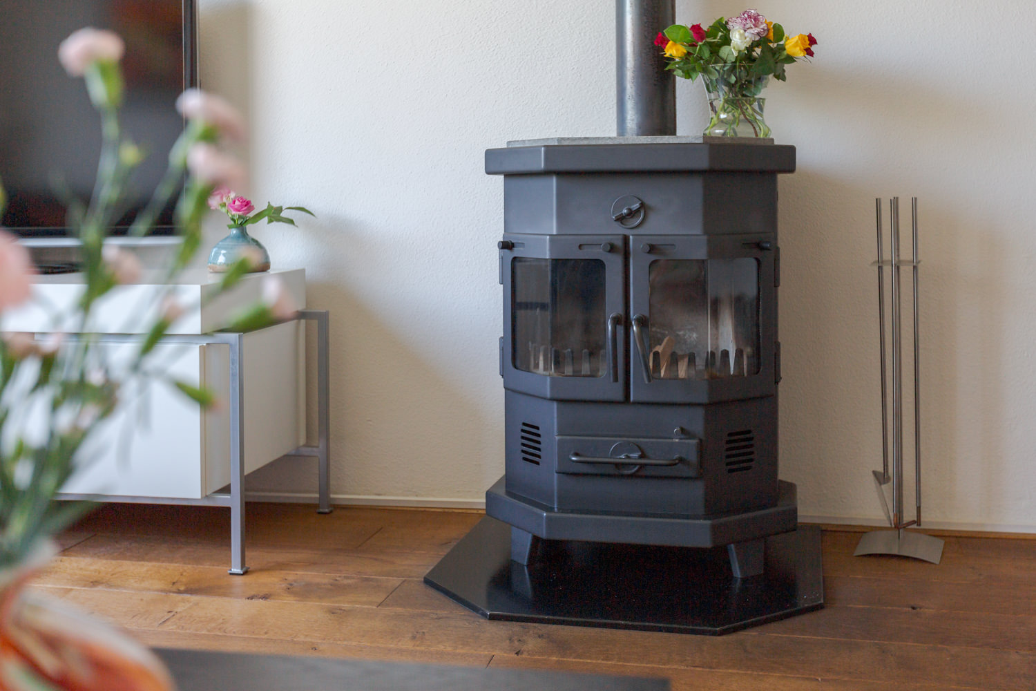 Overdekte entree, centrale hal met uitgebreide elektrakast en toilet met fonteintje, gezellige Z-vormige woonkamer met houtkachelaansluiting, robuuste plankenvloer, tuindeur en deels open keukenruimte met L-vormige keukenopstelling welke is voorzien van diverse inbouwapparatuur.