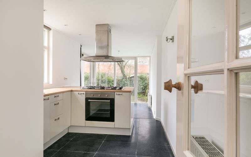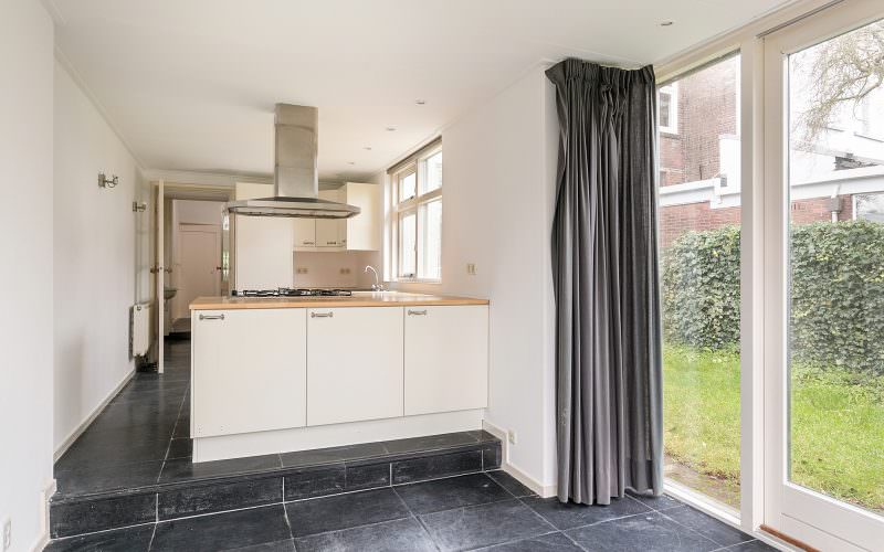 met roedeverdeling waarbij dubbele beglazing is toegepast.Via de tussenhal met originele binnendeur met fraai uitgevoerd glas, origineel fonteintje en separaat toilet, bereikt u de ruime woonkeuken (ca.22 m2) met o.a.een ruim eetgedeelte met schuifpuien naar terras en uitgebreide keukeninrichting met bijbehorende inbouwapparatuur en afwerking met een massief beukenblad.