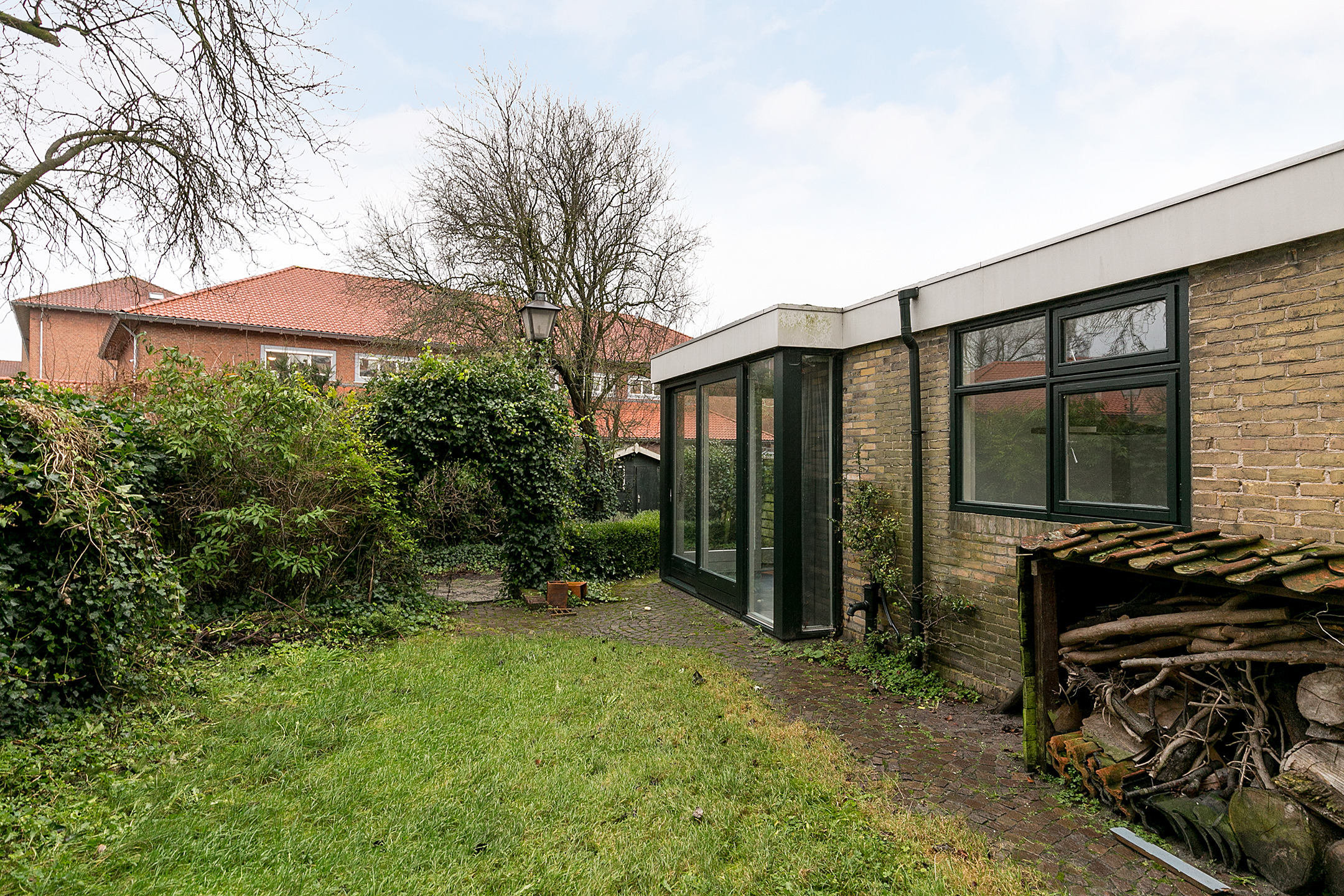 een flinke voortuin en achtertuin met houten bergschuur maakt wonen