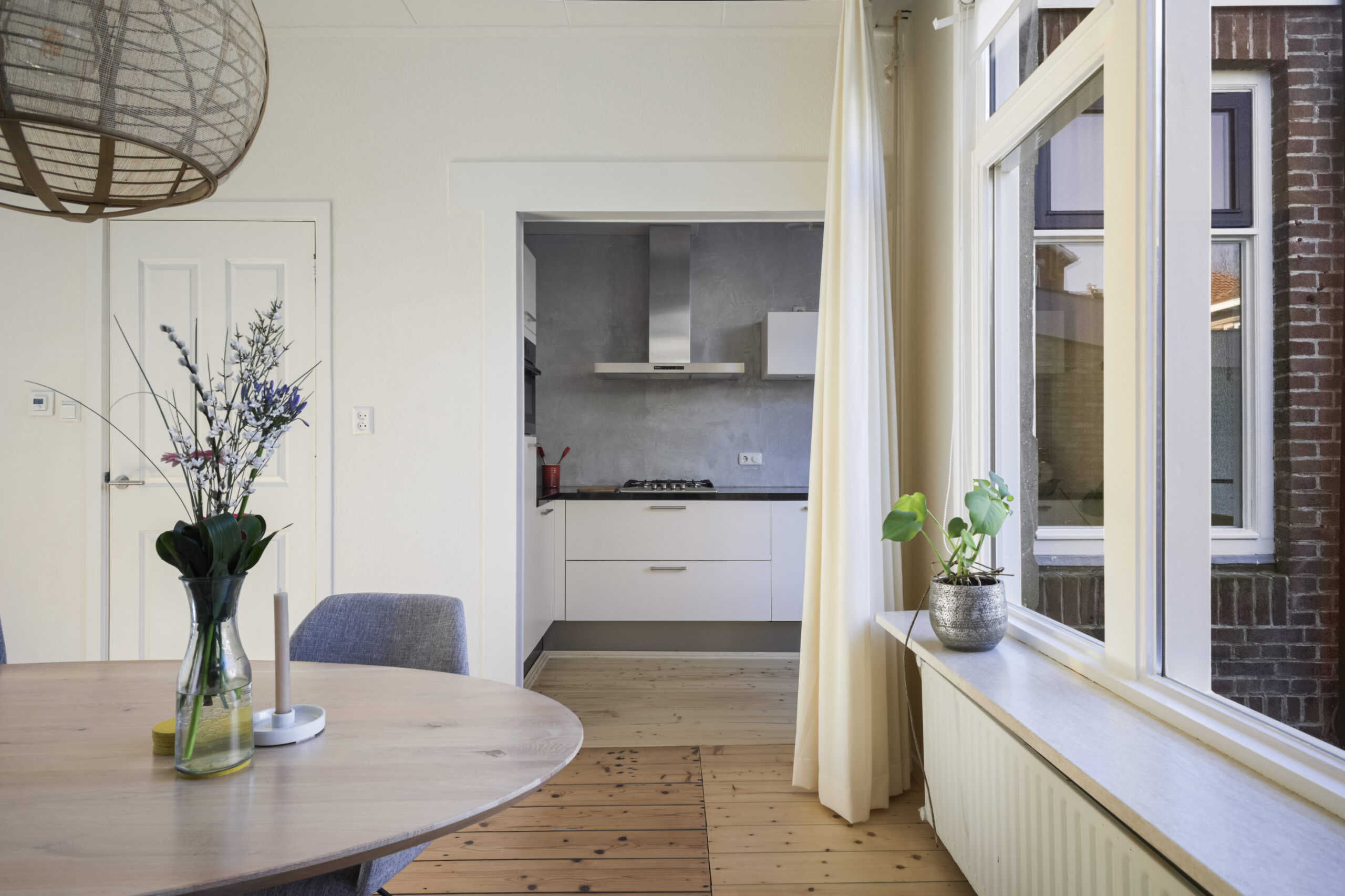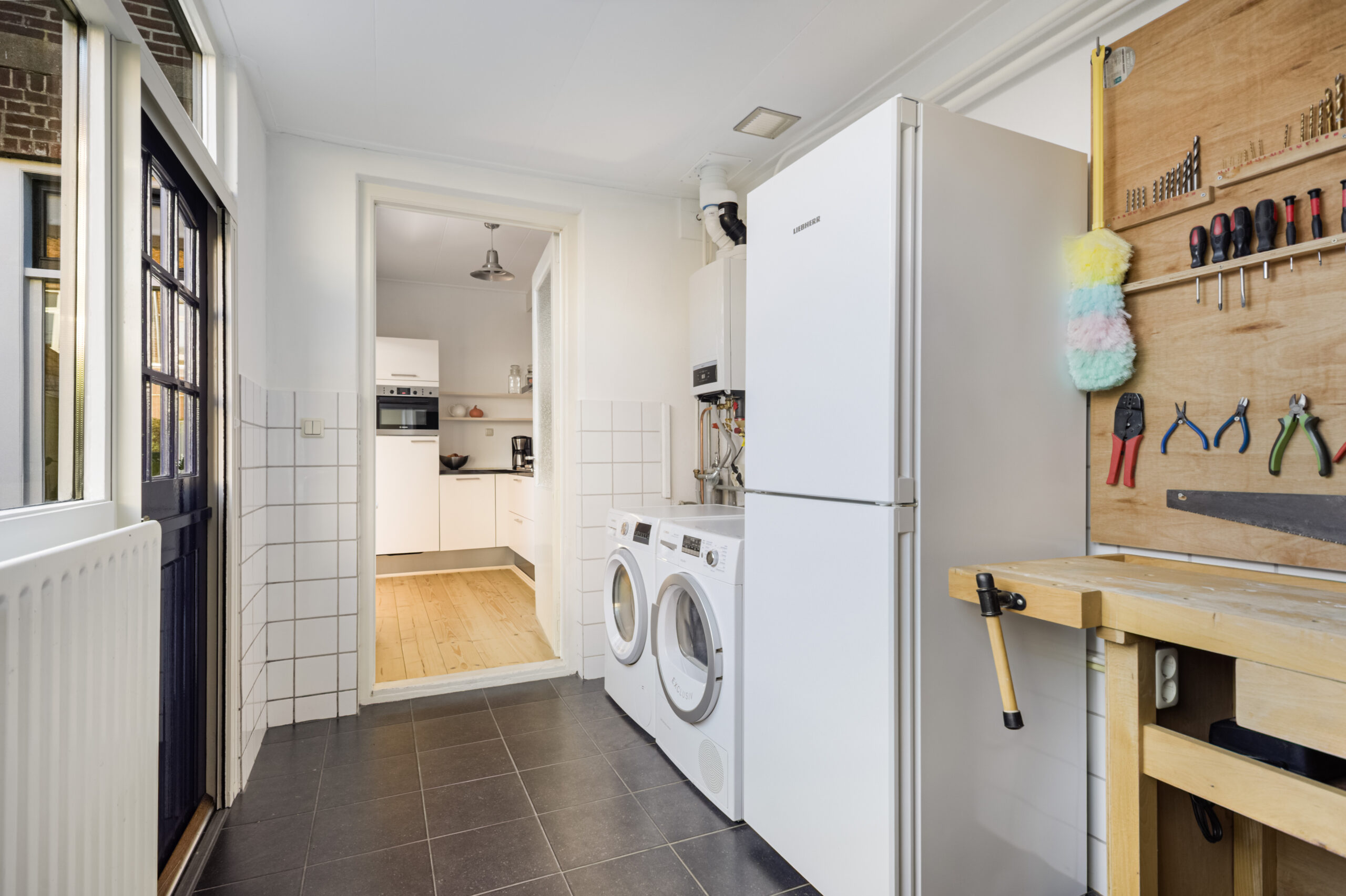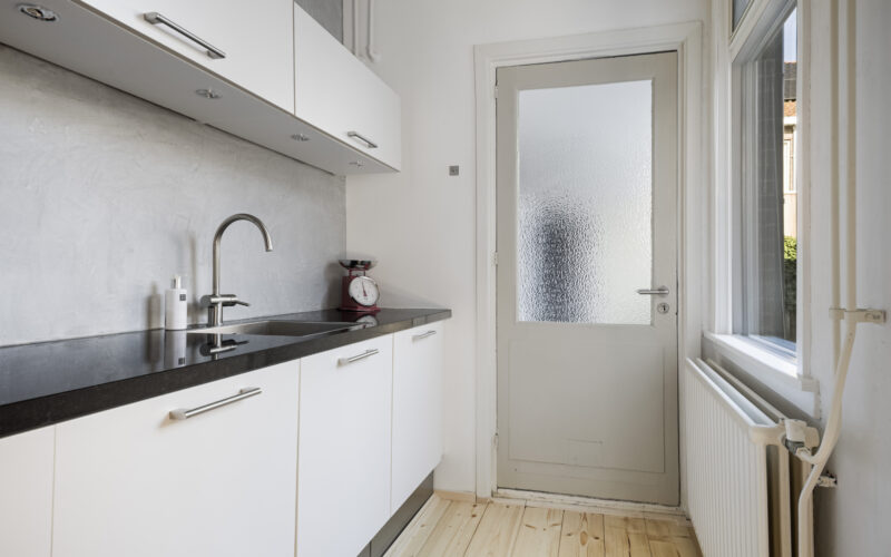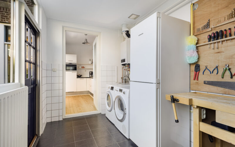 Centrale entree met trapopgang en vaste kast, doorloop naar gezellige-lichte-woonkamer, deels open keukenruimte met moderne L-vormige keukenopstelling v.v. diverse inbouwapparatuur, doorloop naar ruime bijkeuken met vaste kast, wasmachine-aansluiting en toiletinrichting.