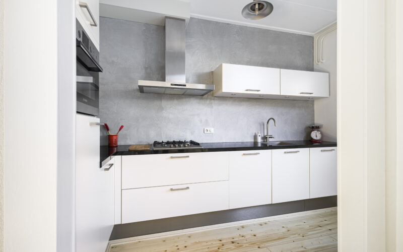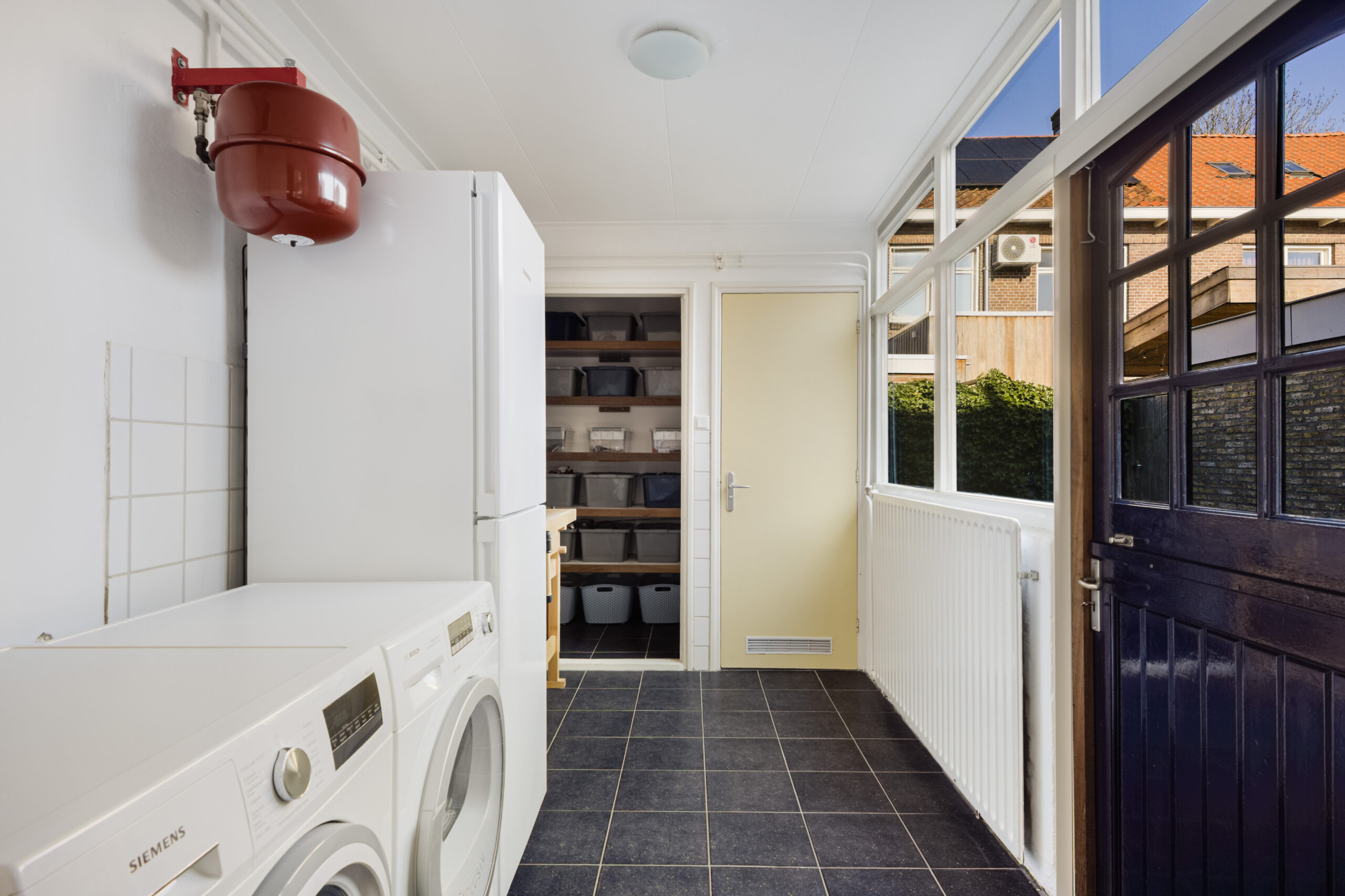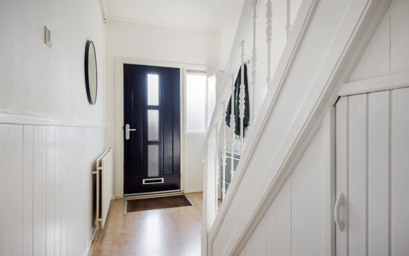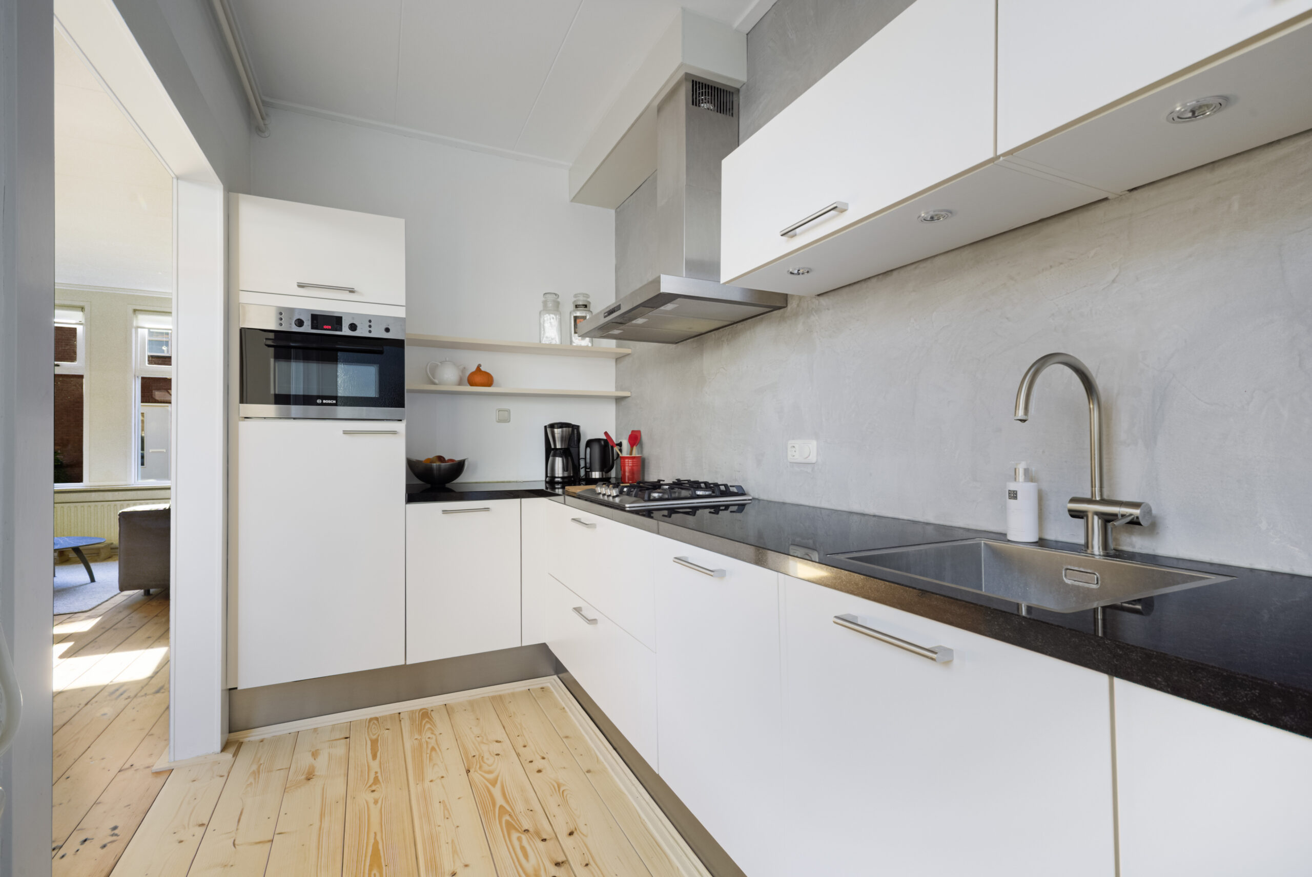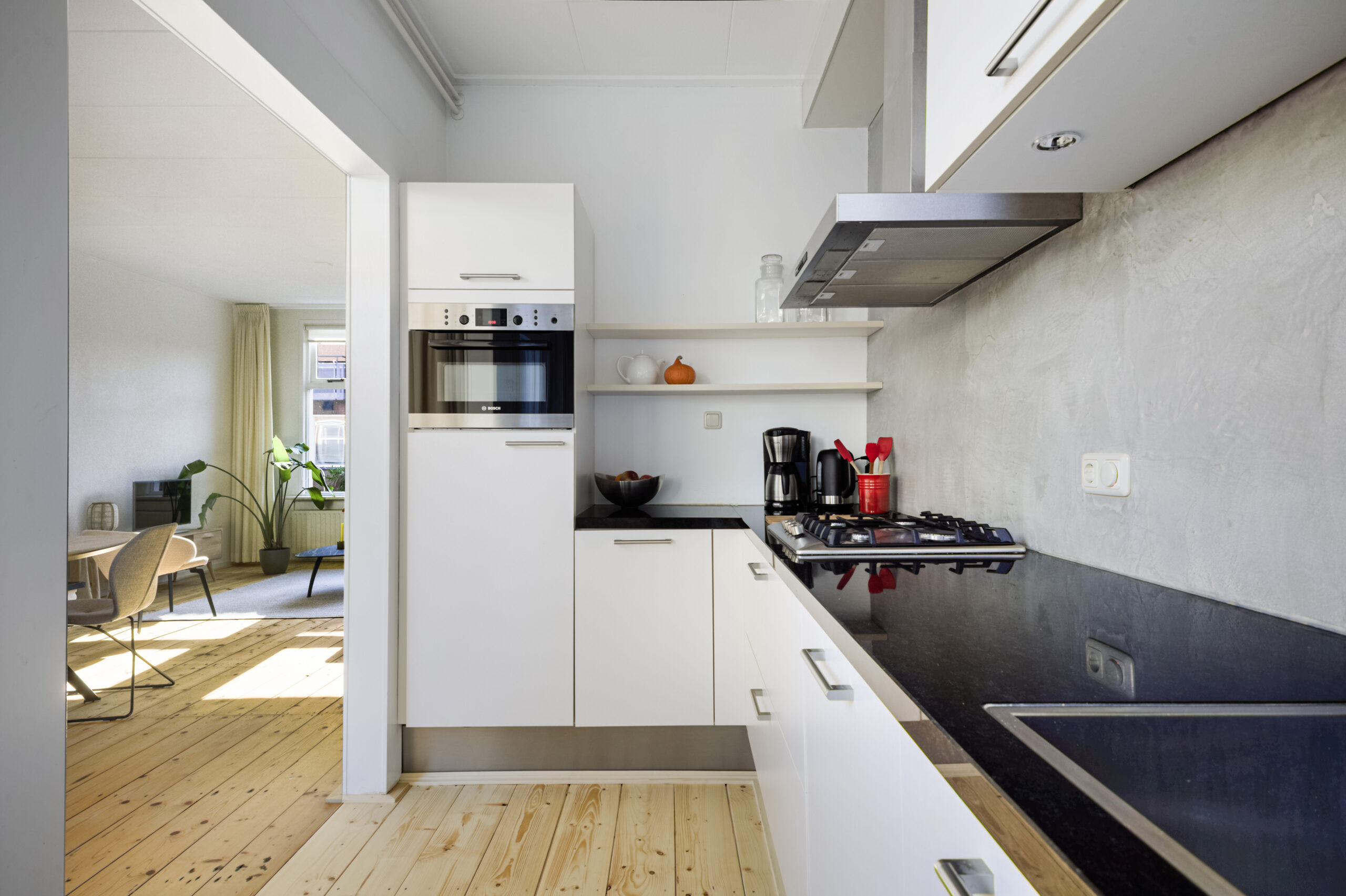 Centrale entree met trapopgang en vaste kast, doorloop naar gezellige-lichte-woonkamer, deels open keukenruimte met moderne L-vormige keukenopstelling v.v. diverse inbouwapparatuur, doorloop naar ruime bijkeuken met vaste kast, wasmachine-aansluiting en toiletinrichting.