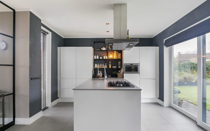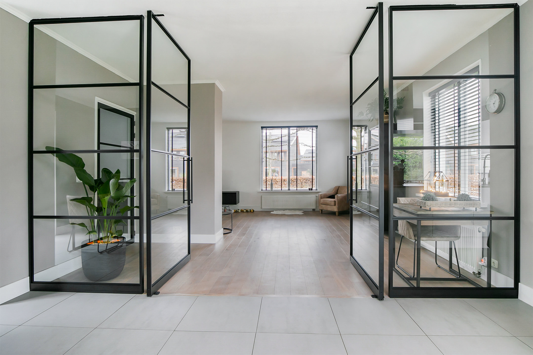 De indeling van deze mooie en ruime woning kunnen wij in het kort als volgt omschrijven:Overdekte entree, royale hal met trapopgang, vaste kast en toegang tot de gezellige en ruime woonkamer met veel raampartijen en mooie zichtlijnen over de tuin en de laan, separate woonkeuken met aangrenzende eetkamer welke door een industriële glazen wand met taatsdeuren van de woonkamer is gescheiden en is voorzien van een tijdloze, moderne keukeninrichting welke uiteraard is uitgerust met diverse inbouwapparatuur. Mooi detail is, dat de keuken en eetkamer middels een schuifpui en tuindeuren toegang geven tot de terrassen.