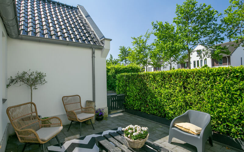 Het wit gestucte herenhuis is in 2004 gebouwd en de uitbouw-red ceder- is in 2014 gerealiseerd.